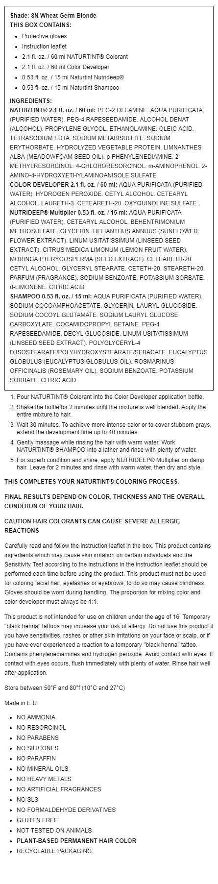 Naturtint Permanent Hair Color 8N Wheat Germ Blonde (Pack of 1), Ammonia Free, Vegan, Cruelty Free, up to 100% Gray Coverage, Long Lasting Results